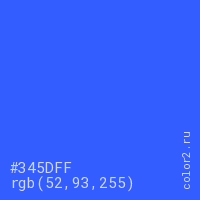 Цвет #345DFF в цветовой модели RGB обозначается тремя октетами (52, 93, 255) в десятичном формате и #345DFF в шестнадцатиричном (hex) формате, которые являются интенсивностью красного 52 (hex 34), интенсивность зелёного 93 (hex 5D) и интенсивность синего 255 (hex FF).
