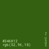 Цвет #346012 в цветовой модели RGB обозначается тремя октетами (52, 96, 18) в десятичном формате и #346012 в шестнадцатиричном (hex) формате, которые являются интенсивностью красного 52 (hex 34), интенсивность зелёного 96 (hex 60) и интенсивность синего 18 (hex 12).