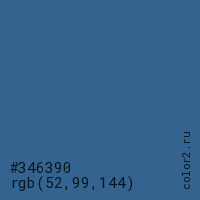 Цвет #346390 в цветовой модели RGB обозначается тремя октетами (52, 99, 144) в десятичном формате и #346390 в шестнадцатиричном (hex) формате, которые являются интенсивностью красного 52 (hex 34), интенсивность зелёного 99 (hex 63) и интенсивность синего 144 (hex 90).