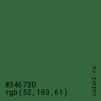 Цвет #34673D в цветовой модели RGB обозначается тремя октетами (52, 103, 61) в десятичном формате и #34673D в шестнадцатиричном (hex) формате, которые являются интенсивностью красного 52 (hex 34), интенсивность зелёного 103 (hex 67) и интенсивность синего 61 (hex 3D).