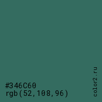 Цвет #346C60 в цветовой модели RGB обозначается тремя октетами (52, 108, 96) в десятичном формате и #346C60 в шестнадцатиричном (hex) формате, которые являются интенсивностью красного 52 (hex 34), интенсивность зелёного 108 (hex 6C) и интенсивность синего 96 (hex 60).