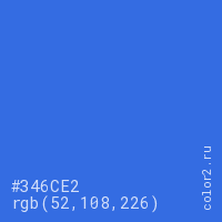 Цвет #346CE2 в цветовой модели RGB обозначается тремя октетами (52, 108, 226) в десятичном формате и #346CE2 в шестнадцатиричном (hex) формате, которые являются интенсивностью красного 52 (hex 34), интенсивность зелёного 108 (hex 6C) и интенсивность синего 226 (hex E2).