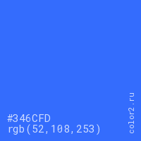 Цвет #346CFD в цветовой модели RGB обозначается тремя октетами (52, 108, 253) в десятичном формате и #346CFD в шестнадцатиричном (hex) формате, которые являются интенсивностью красного 52 (hex 34), интенсивность зелёного 108 (hex 6C) и интенсивность синего 253 (hex FD).