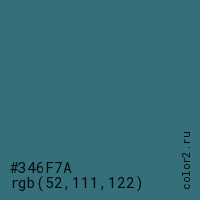 Цвет #346F7A в цветовой модели RGB обозначается тремя октетами (52, 111, 122) в десятичном формате и #346F7A в шестнадцатиричном (hex) формате, которые являются интенсивностью красного 52 (hex 34), интенсивность зелёного 111 (hex 6F) и интенсивность синего 122 (hex 7A).