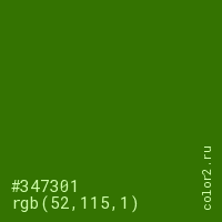 Цвет #347301 в цветовой модели RGB обозначается тремя октетами (52, 115, 1) в десятичном формате и #347301 в шестнадцатиричном (hex) формате, которые являются интенсивностью красного 52 (hex 34), интенсивность зелёного 115 (hex 73) и интенсивность синего 1 (hex 01).