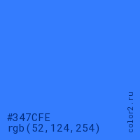 Цвет #347CFE в цветовой модели RGB обозначается тремя октетами (52, 124, 254) в десятичном формате и #347CFE в шестнадцатиричном (hex) формате, которые являются интенсивностью красного 52 (hex 34), интенсивность зелёного 124 (hex 7C) и интенсивность синего 254 (hex FE).
