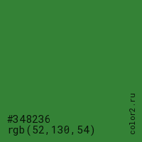 Цвет #348236 в цветовой модели RGB обозначается тремя октетами (52, 130, 54) в десятичном формате и #348236 в шестнадцатиричном (hex) формате, которые являются интенсивностью красного 52 (hex 34), интенсивность зелёного 130 (hex 82) и интенсивность синего 54 (hex 36).