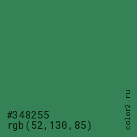 Цвет #348255 в цветовой модели RGB обозначается тремя октетами (52, 130, 85) в десятичном формате и #348255 в шестнадцатиричном (hex) формате, которые являются интенсивностью красного 52 (hex 34), интенсивность зелёного 130 (hex 82) и интенсивность синего 85 (hex 55).