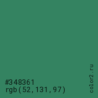 Цвет #348361 в цветовой модели RGB обозначается тремя октетами (52, 131, 97) в десятичном формате и #348361 в шестнадцатиричном (hex) формате, которые являются интенсивностью красного 52 (hex 34), интенсивность зелёного 131 (hex 83) и интенсивность синего 97 (hex 61).
