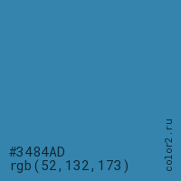 Цвет #3484AD в цветовой модели RGB обозначается тремя октетами (52, 132, 173) в десятичном формате и #3484AD в шестнадцатиричном (hex) формате, которые являются интенсивностью красного 52 (hex 34), интенсивность зелёного 132 (hex 84) и интенсивность синего 173 (hex AD).