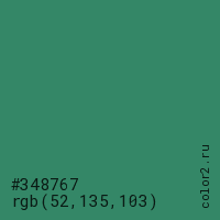 Цвет #348767 в цветовой модели RGB обозначается тремя октетами (52, 135, 103) в десятичном формате и #348767 в шестнадцатиричном (hex) формате, которые являются интенсивностью красного 52 (hex 34), интенсивность зелёного 135 (hex 87) и интенсивность синего 103 (hex 67).