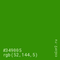 Цвет #349005 в цветовой модели RGB обозначается тремя октетами (52, 144, 5) в десятичном формате и #349005 в шестнадцатиричном (hex) формате, которые являются интенсивностью красного 52 (hex 34), интенсивность зелёного 144 (hex 90) и интенсивность синего 5 (hex 05).