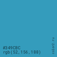 Цвет #349CBC в цветовой модели RGB обозначается тремя октетами (52, 156, 188) в десятичном формате и #349CBC в шестнадцатиричном (hex) формате, которые являются интенсивностью красного 52 (hex 34), интенсивность зелёного 156 (hex 9C) и интенсивность синего 188 (hex BC).