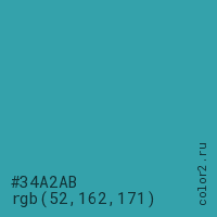 Цвет #34A2AB в цветовой модели RGB обозначается тремя октетами (52, 162, 171) в десятичном формате и #34A2AB в шестнадцатиричном (hex) формате, которые являются интенсивностью красного 52 (hex 34), интенсивность зелёного 162 (hex A2) и интенсивность синего 171 (hex AB).