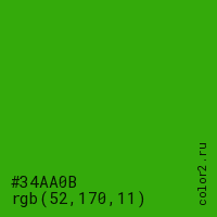 Цвет #34AA0B в цветовой модели RGB обозначается тремя октетами (52, 170, 11) в десятичном формате и #34AA0B в шестнадцатиричном (hex) формате, которые являются интенсивностью красного 52 (hex 34), интенсивность зелёного 170 (hex AA) и интенсивность синего 11 (hex 0B).