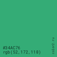 Цвет #34AC76 в цветовой модели RGB обозначается тремя октетами (52, 172, 118) в десятичном формате и #34AC76 в шестнадцатиричном (hex) формате, которые являются интенсивностью красного 52 (hex 34), интенсивность зелёного 172 (hex AC) и интенсивность синего 118 (hex 76).