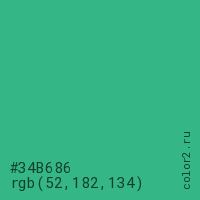 Цвет #34B686 в цветовой модели RGB обозначается тремя октетами (52, 182, 134) в десятичном формате и #34B686 в шестнадцатиричном (hex) формате, которые являются интенсивностью красного 52 (hex 34), интенсивность зелёного 182 (hex B6) и интенсивность синего 134 (hex 86).