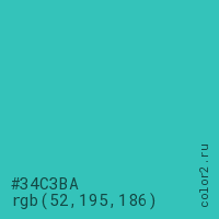 Цвет #34C3BA в цветовой модели RGB обозначается тремя октетами (52, 195, 186) в десятичном формате и #34C3BA в шестнадцатиричном (hex) формате, которые являются интенсивностью красного 52 (hex 34), интенсивность зелёного 195 (hex C3) и интенсивность синего 186 (hex BA).