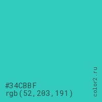 Цвет #34CBBF в цветовой модели RGB обозначается тремя октетами (52, 203, 191) в десятичном формате и #34CBBF в шестнадцатиричном (hex) формате, которые являются интенсивностью красного 52 (hex 34), интенсивность зелёного 203 (hex CB) и интенсивность синего 191 (hex BF).