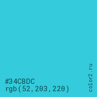 Цвет #34CBDC в цветовой модели RGB обозначается тремя октетами (52, 203, 220) в десятичном формате и #34CBDC в шестнадцатиричном (hex) формате, которые являются интенсивностью красного 52 (hex 34), интенсивность зелёного 203 (hex CB) и интенсивность синего 220 (hex DC).