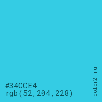 Цвет #34CCE4 в цветовой модели RGB обозначается тремя октетами (52, 204, 228) в десятичном формате и #34CCE4 в шестнадцатиричном (hex) формате, которые являются интенсивностью красного 52 (hex 34), интенсивность зелёного 204 (hex CC) и интенсивность синего 228 (hex E4).