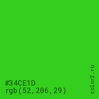 Цвет #34CE1D в цветовой модели RGB обозначается тремя октетами (52, 206, 29) в десятичном формате и #34CE1D в шестнадцатиричном (hex) формате, которые являются интенсивностью красного 52 (hex 34), интенсивность зелёного 206 (hex CE) и интенсивность синего 29 (hex 1D).