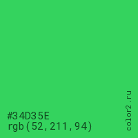 Цвет #34D35E в цветовой модели RGB обозначается тремя октетами (52, 211, 94) в десятичном формате и #34D35E в шестнадцатиричном (hex) формате, которые являются интенсивностью красного 52 (hex 34), интенсивность зелёного 211 (hex D3) и интенсивность синего 94 (hex 5E).