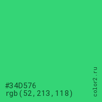 Цвет #34D576 в цветовой модели RGB обозначается тремя октетами (52, 213, 118) в десятичном формате и #34D576 в шестнадцатиричном (hex) формате, которые являются интенсивностью красного 52 (hex 34), интенсивность зелёного 213 (hex D5) и интенсивность синего 118 (hex 76).