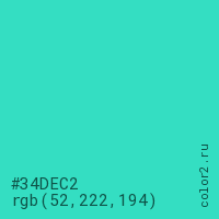 Цвет #34DEC2 в цветовой модели RGB обозначается тремя октетами (52, 222, 194) в десятичном формате и #34DEC2 в шестнадцатиричном (hex) формате, которые являются интенсивностью красного 52 (hex 34), интенсивность зелёного 222 (hex DE) и интенсивность синего 194 (hex C2).