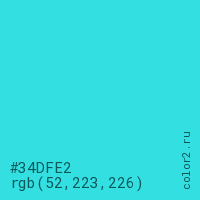 Цвет #34DFE2 в цветовой модели RGB обозначается тремя октетами (52, 223, 226) в десятичном формате и #34DFE2 в шестнадцатиричном (hex) формате, которые являются интенсивностью красного 52 (hex 34), интенсивность зелёного 223 (hex DF) и интенсивность синего 226 (hex E2).