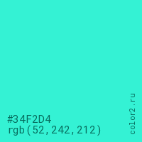 Цвет #34F2D4 в цветовой модели RGB обозначается тремя октетами (52, 242, 212) в десятичном формате и #34F2D4 в шестнадцатиричном (hex) формате, которые являются интенсивностью красного 52 (hex 34), интенсивность зелёного 242 (hex F2) и интенсивность синего 212 (hex D4).
