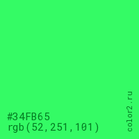 Цвет #34FB65 в цветовой модели RGB обозначается тремя октетами (52, 251, 101) в десятичном формате и #34FB65 в шестнадцатиричном (hex) формате, которые являются интенсивностью красного 52 (hex 34), интенсивность зелёного 251 (hex FB) и интенсивность синего 101 (hex 65).