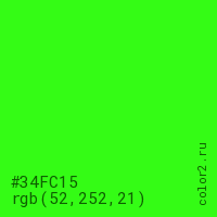 Цвет #34FC15 в цветовой модели RGB обозначается тремя октетами (52, 252, 21) в десятичном формате и #34FC15 в шестнадцатиричном (hex) формате, которые являются интенсивностью красного 52 (hex 34), интенсивность зелёного 252 (hex FC) и интенсивность синего 21 (hex 15).