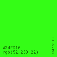 Цвет #34FD16 в цветовой модели RGB обозначается тремя октетами (52, 253, 22) в десятичном формате и #34FD16 в шестнадцатиричном (hex) формате, которые являются интенсивностью красного 52 (hex 34), интенсивность зелёного 253 (hex FD) и интенсивность синего 22 (hex 16).