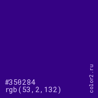 Цвет #350284 в цветовой модели RGB обозначается тремя октетами (53, 2, 132) в десятичном формате и #350284 в шестнадцатиричном (hex) формате, которые являются интенсивностью красного 53 (hex 35), интенсивность зелёного 2 (hex 02) и интенсивность синего 132 (hex 84).