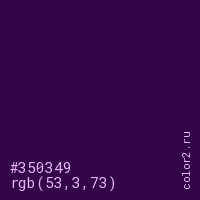 Цвет #350349 в цветовой модели RGB обозначается тремя октетами (53, 3, 73) в десятичном формате и #350349 в шестнадцатиричном (hex) формате, которые являются интенсивностью красного 53 (hex 35), интенсивность зелёного 3 (hex 03) и интенсивность синего 73 (hex 49).