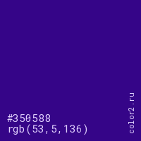 Цвет #350588 в цветовой модели RGB обозначается тремя октетами (53, 5, 136) в десятичном формате и #350588 в шестнадцатиричном (hex) формате, которые являются интенсивностью красного 53 (hex 35), интенсивность зелёного 5 (hex 05) и интенсивность синего 136 (hex 88).