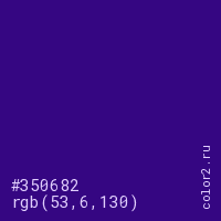 Цвет #350682 в цветовой модели RGB обозначается тремя октетами (53, 6, 130) в десятичном формате и #350682 в шестнадцатиричном (hex) формате, которые являются интенсивностью красного 53 (hex 35), интенсивность зелёного 6 (hex 06) и интенсивность синего 130 (hex 82).