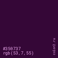 Цвет #350737 в цветовой модели RGB обозначается тремя октетами (53, 7, 55) в десятичном формате и #350737 в шестнадцатиричном (hex) формате, которые являются интенсивностью красного 53 (hex 35), интенсивность зелёного 7 (hex 07) и интенсивность синего 55 (hex 37).