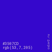 Цвет #3507CD в цветовой модели RGB обозначается тремя октетами (53, 7, 205) в десятичном формате и #3507CD в шестнадцатиричном (hex) формате, которые являются интенсивностью красного 53 (hex 35), интенсивность зелёного 7 (hex 07) и интенсивность синего 205 (hex CD).