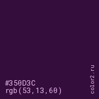 Цвет #350D3C в цветовой модели RGB обозначается тремя октетами (53, 13, 60) в десятичном формате и #350D3C в шестнадцатиричном (hex) формате, которые являются интенсивностью красного 53 (hex 35), интенсивность зелёного 13 (hex 0D) и интенсивность синего 60 (hex 3C).