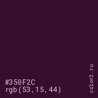 Цвет #350F2C в цветовой модели RGB обозначается тремя октетами (53, 15, 44) в десятичном формате и #350F2C в шестнадцатиричном (hex) формате, которые являются интенсивностью красного 53 (hex 35), интенсивность зелёного 15 (hex 0F) и интенсивность синего 44 (hex 2C).