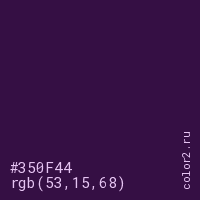 Цвет #350F44 в цветовой модели RGB обозначается тремя октетами (53, 15, 68) в десятичном формате и #350F44 в шестнадцатиричном (hex) формате, которые являются интенсивностью красного 53 (hex 35), интенсивность зелёного 15 (hex 0F) и интенсивность синего 68 (hex 44).