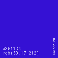 Цвет #3511D4 в цветовой модели RGB обозначается тремя октетами (53, 17, 212) в десятичном формате и #3511D4 в шестнадцатиричном (hex) формате, которые являются интенсивностью красного 53 (hex 35), интенсивность зелёного 17 (hex 11) и интенсивность синего 212 (hex D4).