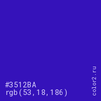 Цвет #3512BA в цветовой модели RGB обозначается тремя октетами (53, 18, 186) в десятичном формате и #3512BA в шестнадцатиричном (hex) формате, которые являются интенсивностью красного 53 (hex 35), интенсивность зелёного 18 (hex 12) и интенсивность синего 186 (hex BA).