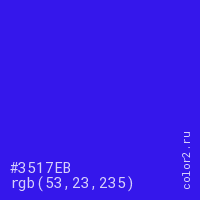 Цвет #3517EB в цветовой модели RGB обозначается тремя октетами (53, 23, 235) в десятичном формате и #3517EB в шестнадцатиричном (hex) формате, которые являются интенсивностью красного 53 (hex 35), интенсивность зелёного 23 (hex 17) и интенсивность синего 235 (hex EB).