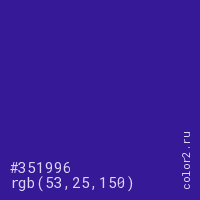 Цвет #351996 в цветовой модели RGB обозначается тремя октетами (53, 25, 150) в десятичном формате и #351996 в шестнадцатиричном (hex) формате, которые являются интенсивностью красного 53 (hex 35), интенсивность зелёного 25 (hex 19) и интенсивность синего 150 (hex 96).