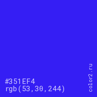 Цвет #351EF4 в цветовой модели RGB обозначается тремя октетами (53, 30, 244) в десятичном формате и #351EF4 в шестнадцатиричном (hex) формате, которые являются интенсивностью красного 53 (hex 35), интенсивность зелёного 30 (hex 1E) и интенсивность синего 244 (hex F4).
