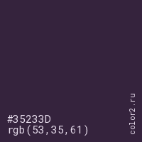 Цвет #35233D в цветовой модели RGB обозначается тремя октетами (53, 35, 61) в десятичном формате и #35233D в шестнадцатиричном (hex) формате, которые являются интенсивностью красного 53 (hex 35), интенсивность зелёного 35 (hex 23) и интенсивность синего 61 (hex 3D).