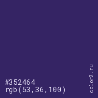 Цвет #352464 в цветовой модели RGB обозначается тремя октетами (53, 36, 100) в десятичном формате и #352464 в шестнадцатиричном (hex) формате, которые являются интенсивностью красного 53 (hex 35), интенсивность зелёного 36 (hex 24) и интенсивность синего 100 (hex 64).
